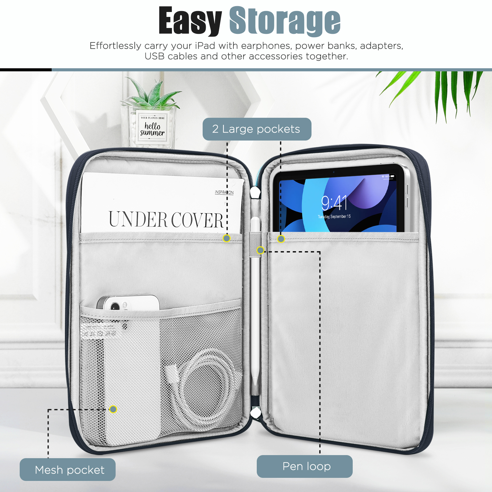 Mehrere Fächer bieten ausreichend Platz für Ihr Tablet und Zubehör (z. B. Kabel, Mäuse, Kopfhörer, Notizen, Brieftaschen, Karten und weitere kleine Gegenstände).