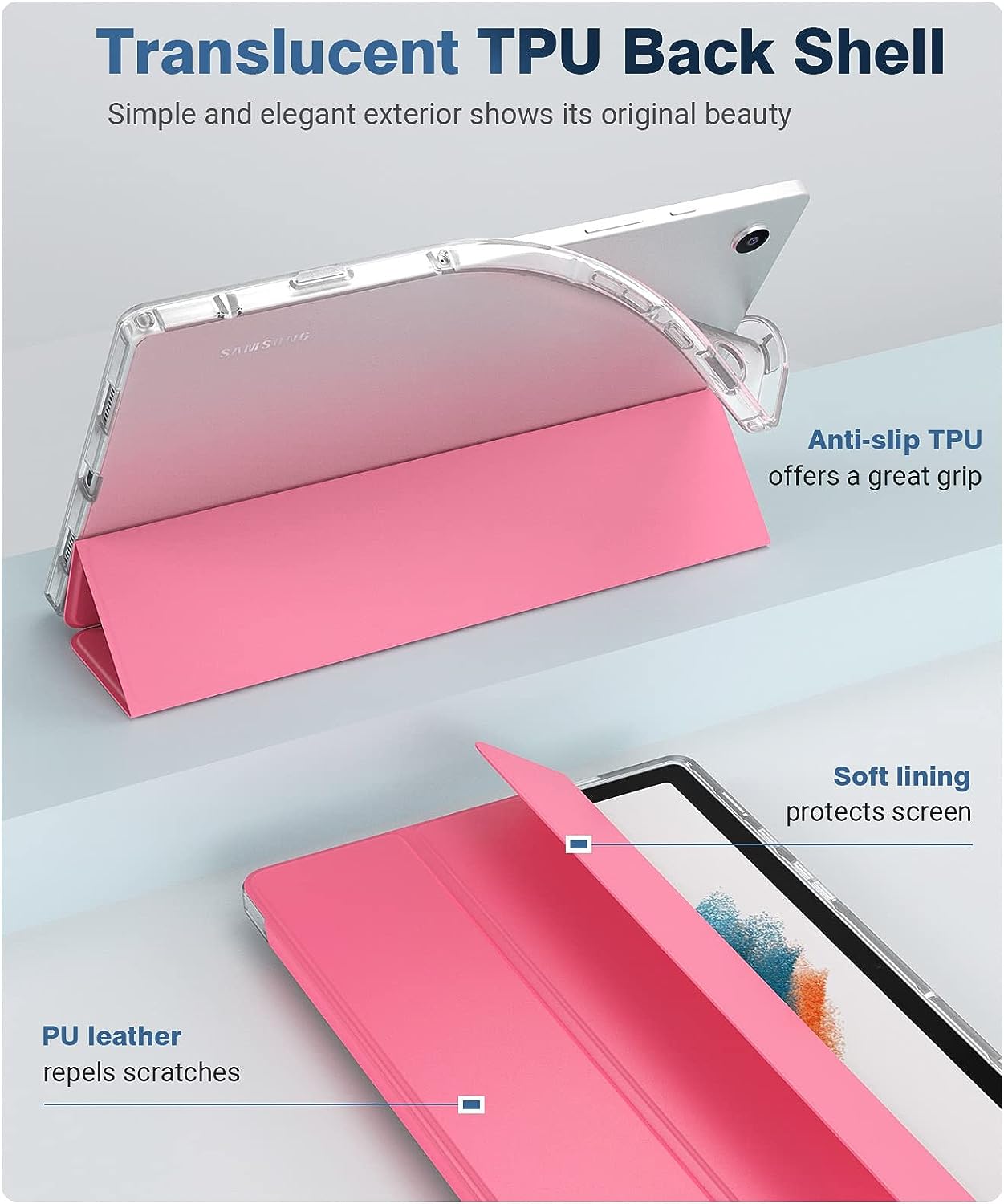 【Galaxy Tab A8 Case】Front PU leather and soft TPU back translucent cover provide full-body protection against scratches, shocks, drops, and impacts. It is convenient for you to see the Galaxy Tab A8 Tablet icon with the frosted translucent back cover.
