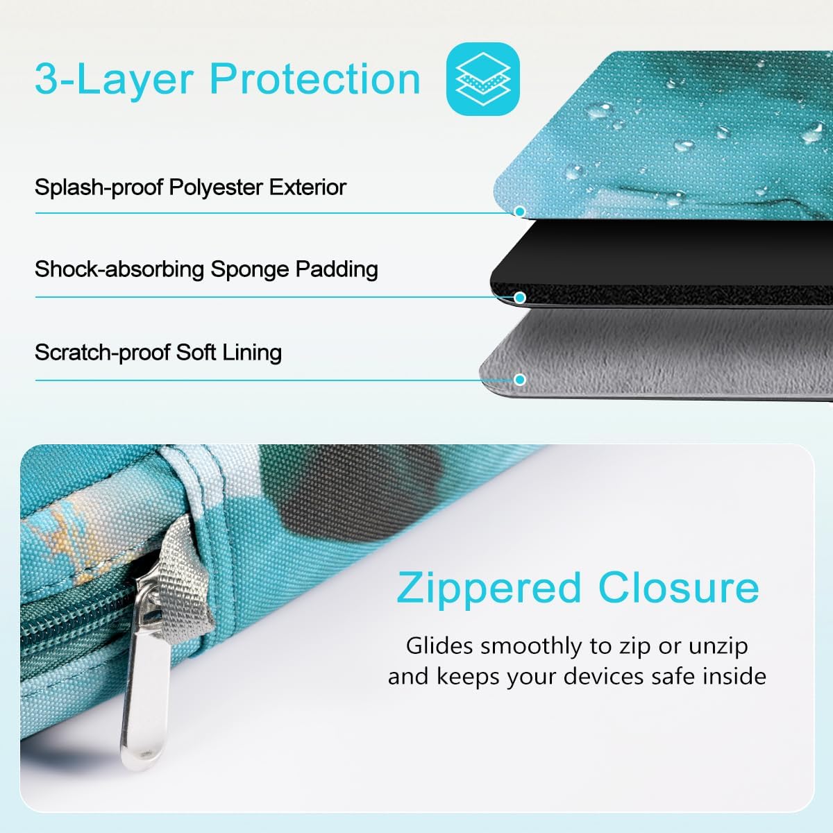 【Waterproof & Durable Materials】 – This protective sleeve is made of premium material with fine workmanship, the water-repellent exterior can protect against fluids and dust, and the padded foam interlayer and soft fleece interior lining are soft and safe for your device, keeping your device from being accidental bumps and scratched.