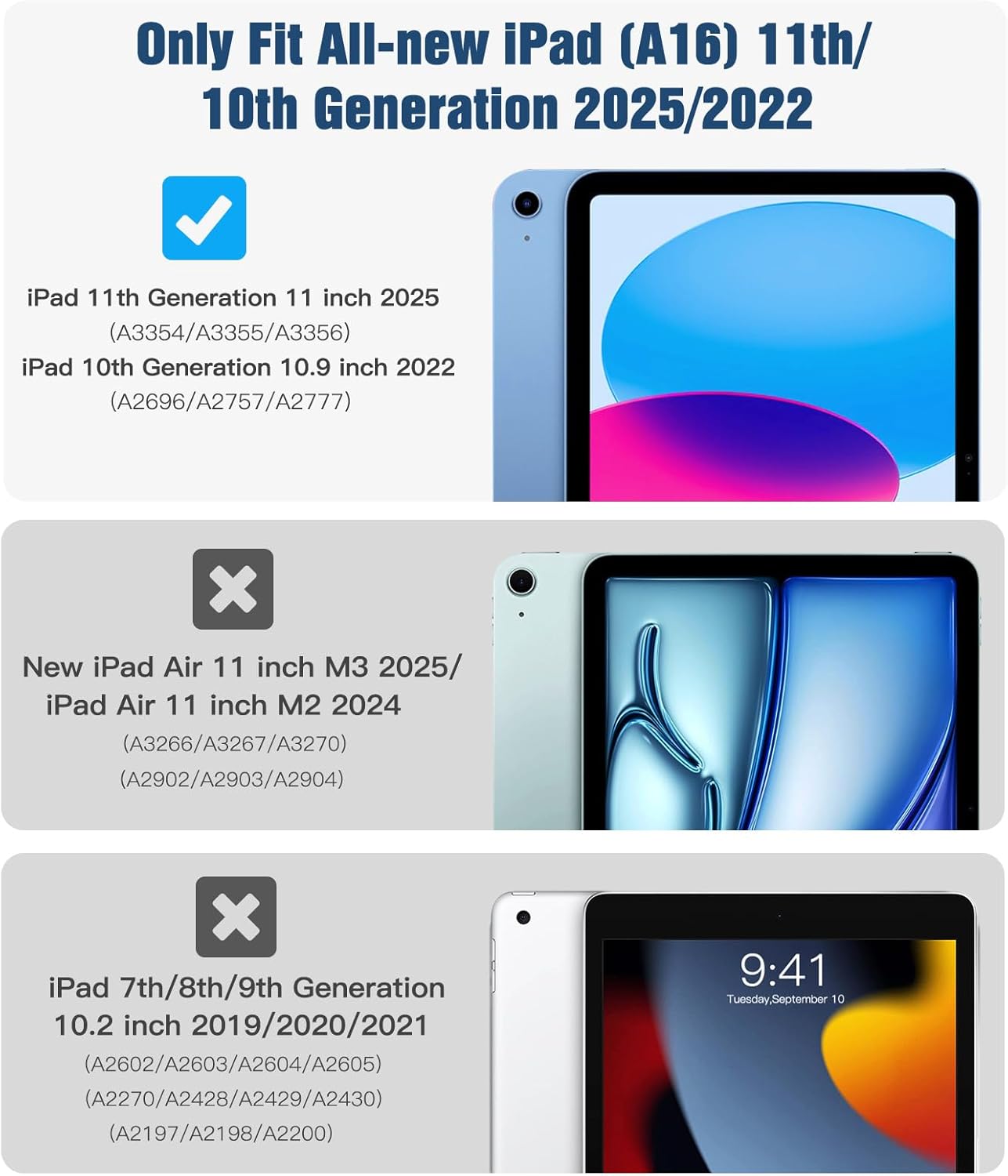 Compatibilità: Questa custodia è compatibile con iPad (A16) 11a generazione 2025 11 pollici(Numero di Modello: A3354 A3355 A3356)/iPad 10 Generazione 2022 10,9″(Numero di Modello: A2696 A2757 A2777 A3162). Non è compatibile con altri modelli
