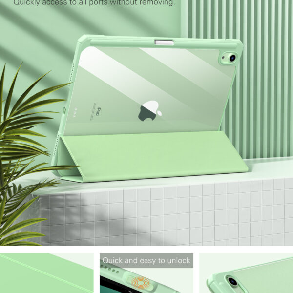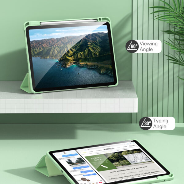 -Magneti incorporati, piegati in un supporto. Piegare il coperchio anteriore per una comoda posizione di visione a mani libere. È perfetto per i tuoi film e programmi preferiti. Quando hai bisogno di fare un po’ di lavoro, puoi regolare il supporto per una comoda posizione di battitura.