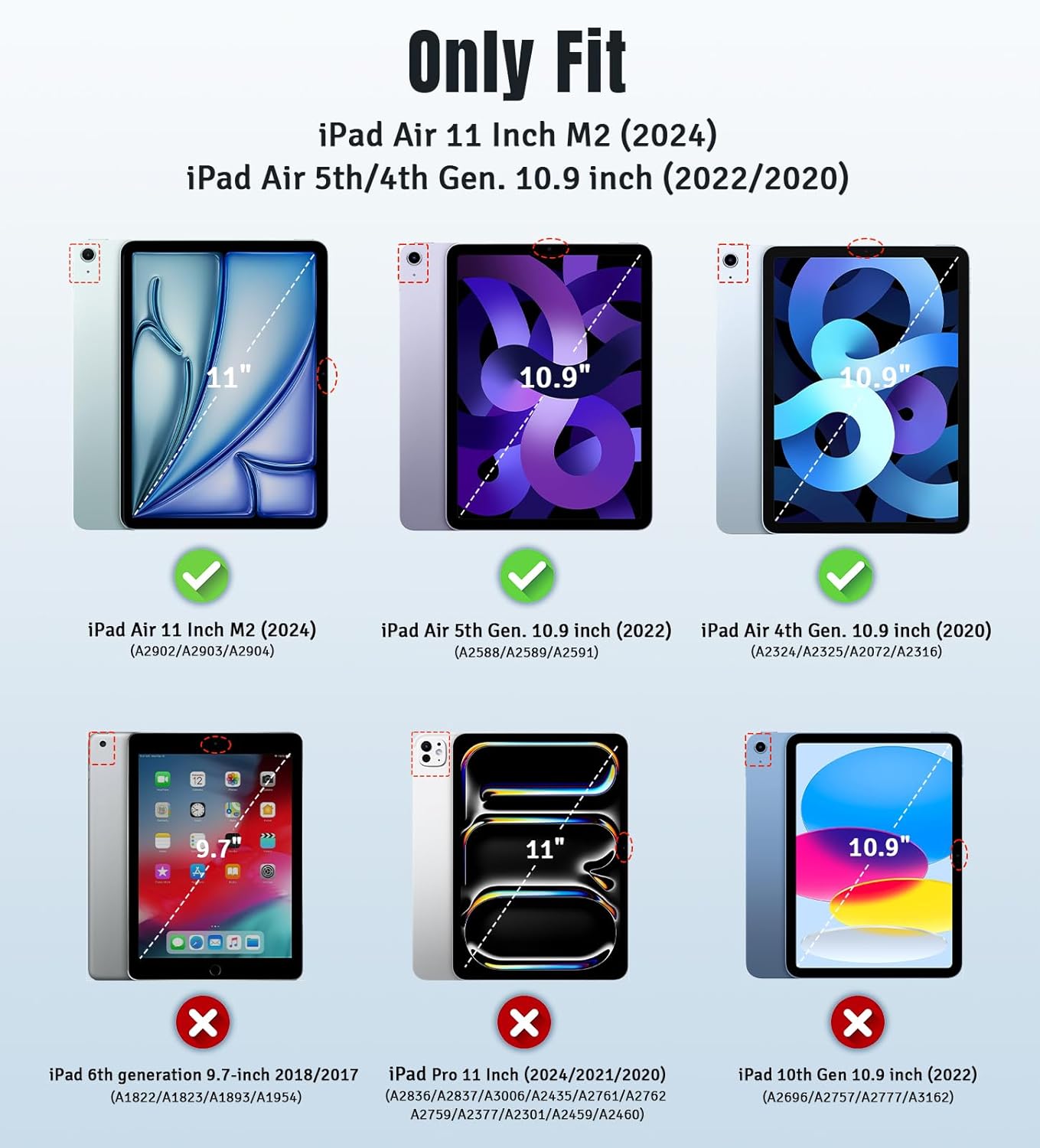 Specially designed for iPad Air 11 Inch M3 2025(A3266/A3267/A3270)/iPad Air 11 Inch M2 2024(A2902/A2903/A2904)/iPad Air 5th generation 2022(A2588/A2589/A2591)/ iPad Air 4th generation 2020 (A2072/A2316/A2324/A2325). Note: It will not be compatible with other iPad Models.