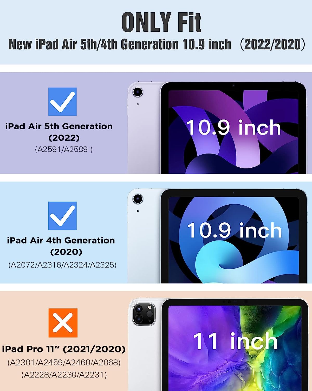 Especialmente diseña para Nuevo iPad 10.9 Pulgadas, iPad Air 5.ª Generación 2022 (Número de modelo: A2588/A2589/A2591) /iPad Air 4.ª Generación 2020 (Número de modelo: A2072/A2316/A2324/A2325) sólo. Nota: No es compatible con 2nd Gen Apple Pencil.