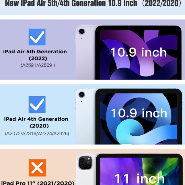 Especialmente diseña para Nuevo iPad 10.9 Pulgadas, iPad Air 5.ª Generación 2022 (Número de modelo: A2588/A2589/A2591) /iPad Air 4.ª Generación 2020 (Número de modelo: A2072/A2316/A2324/A2325) sólo. Nota: No es compatible con 2nd Gen Apple Pencil.